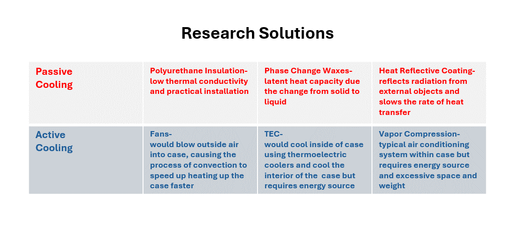 I initially explored active cooling and considered several methods. The first idea was to use fans, which could blow air from outside into the case. However, I realized that this would actually accelerate the temperature rise by blowing hot air from the outside environment, defeating the goal of keeping the case regulated. Next, I looked into combining TECs (thermoelectric coolers) with fans to blow cold air into the case, but this solution required a power source, such as a battery or outlet, and would take up too much space while adding excessive weight—making the case impractical to use. I also explored vapor compression cooling, a common system used in air conditioning for homes and cars. However, this method had the same drawbacks as fans: the need for an energy source and the addition of excessive size and weight. After evaluating these active cooling options, I decided to shift my focus to passive cooling.